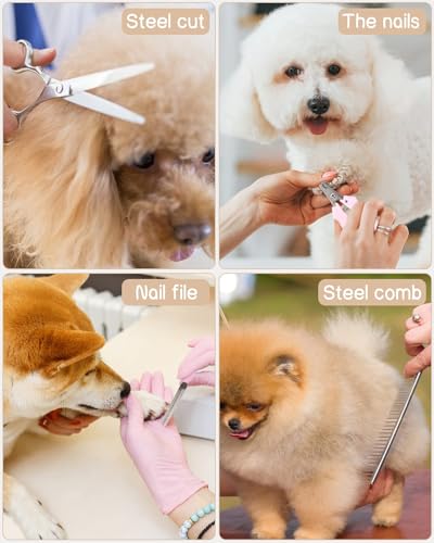 Value set: The cordless pet hair trimmer contains all the accessories for efficient grooming: 1 professional dog hair trimmer with ceramic blades, 4 combs, 1 stainless steel scissors, 1 stainless steel comb, 1 cleaning brush, 1 nail clipper, 1 nail grinding stick, 1 replacement ceramic blade, 1 USB charging cable, 1 user manual and 1 bottle of machine tool. mmmmThe complete set is ideal for shaving and grooming your pet’s dense coat.
