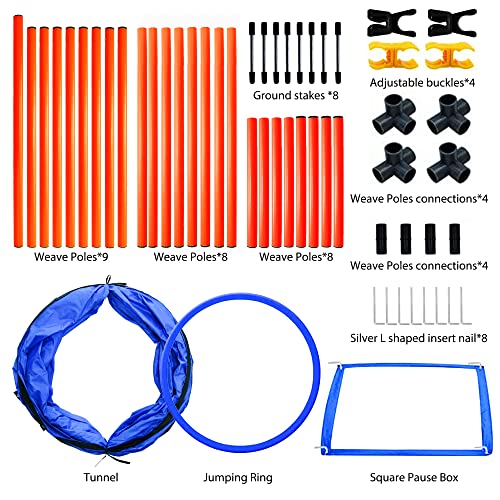 Specification: GeerDuo Dog Agility Training Equipment, Obstacle Agility Training Kit for Dogs, Includes Tunnel, 27 Woven Poles, Adjustable Hurdle, Jump Ring, Break Box and Carry Bag (Blue, L)