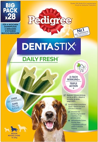 Specification: Pedigree DentaStix Daily Fresh dental care snack for medium-sized dogs – dog treats with active ingredients for every day – for healthy teeth and fresh breath – 112 sticks (4 x 28 pieces)